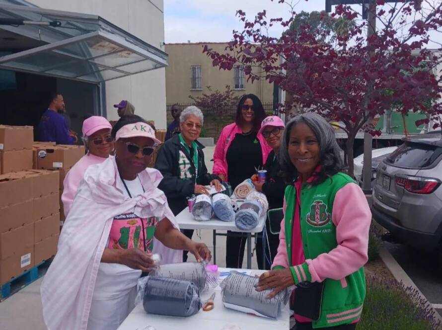 Mu Lambda Omega Chapter of Alpha Kappa Alpha Sorority Incorporated & Mu Sigma Lambda Chapter of Alpha Phi Alpha Fraternity Incorporated partnered with Genesis Bank to deliver backpacks and lunchboxes at Wilshire Crest back to school night.