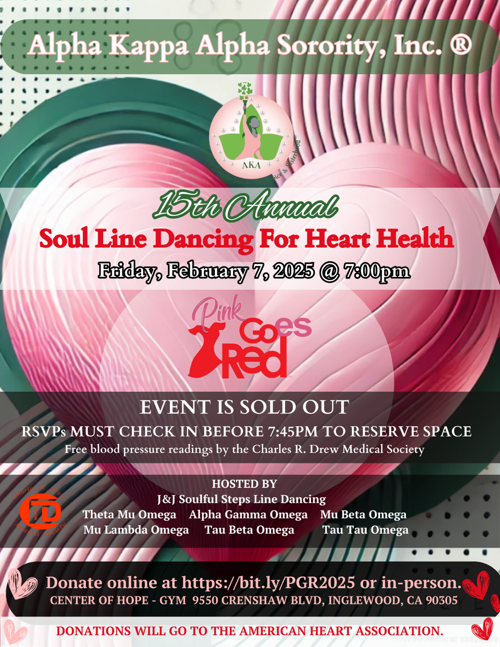 Please join sponsoring chapters Theta Mu Omega, Alpha Gamma Omega, Mu Beta Omega, Mu Lambda Omega, Tau Beta Omega and Tau Tau Omega as we fundraise at Pink Goes Red for some heart healthy soul line dancing with J&J Soulful Steps, opportunity drawings, health education, and fellowship.
