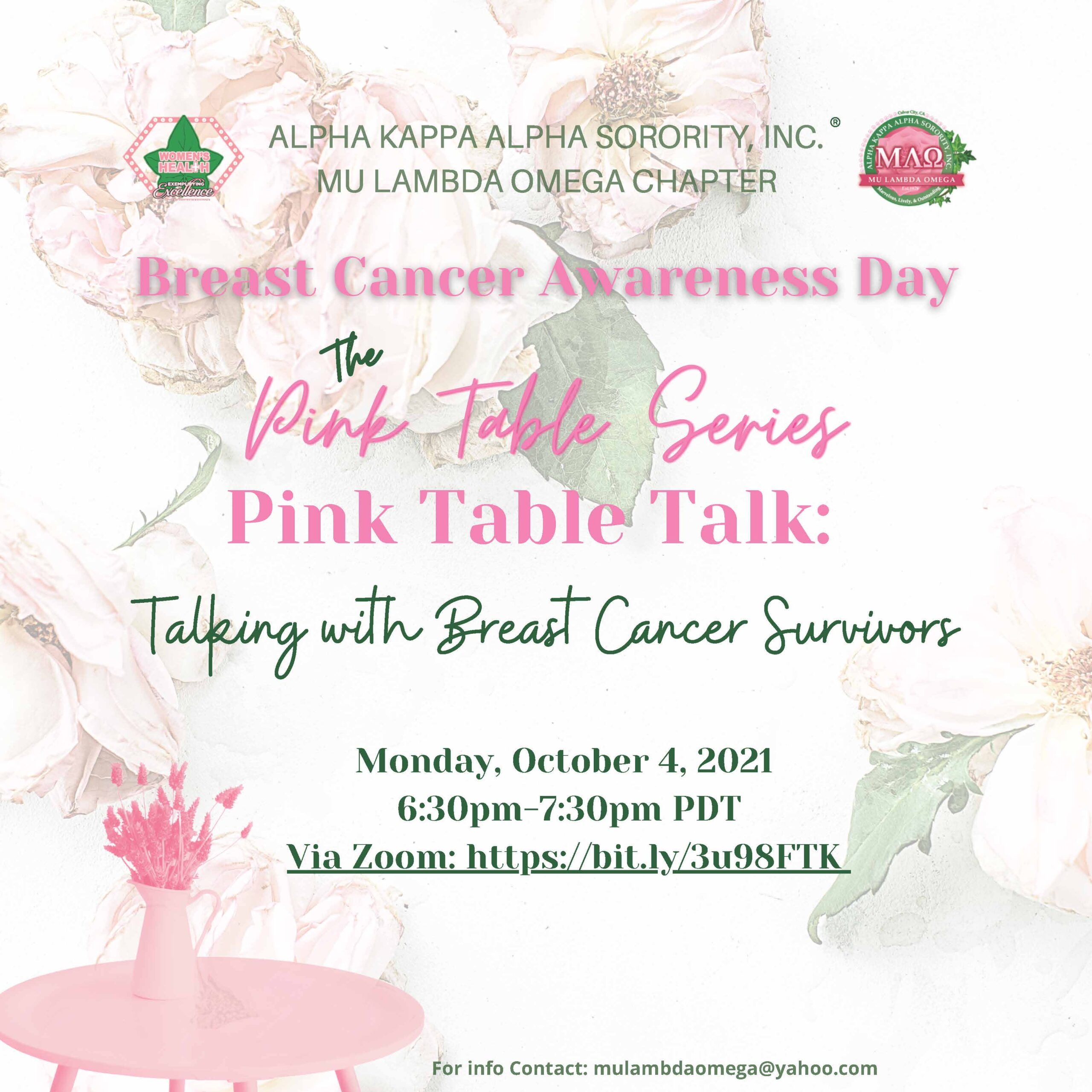 Join Mu Lambda Omega Chapter on Monday, October 4, 2020 at 6:30 pm for Talking with Breast Cancer Survivors, Part I of a two-part online Pink Table Talk Series.